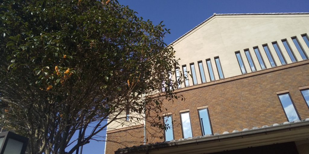 金木犀も咲いている 長府駅横にある長府東公民館。窓に空が映り込み、きれいでした!