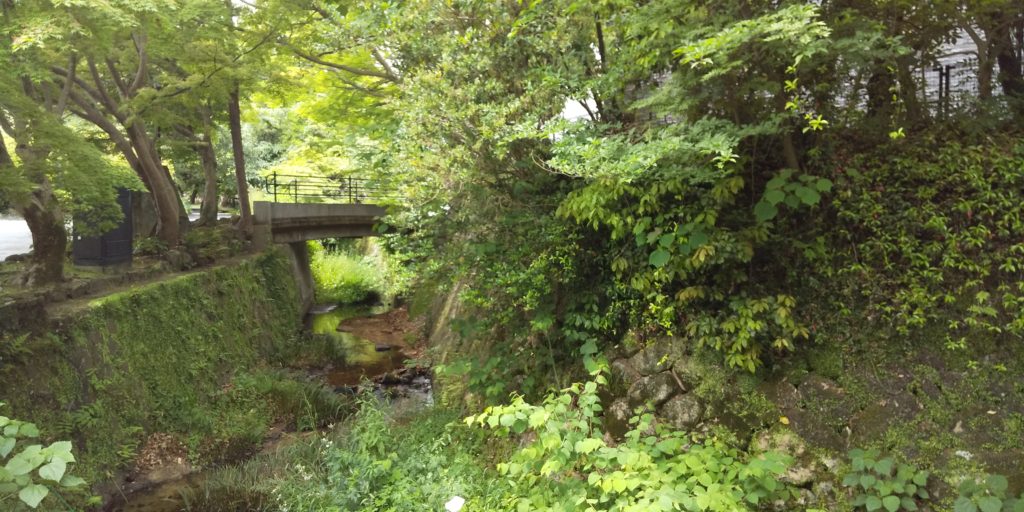 長府郵便局側から進め、つきあたりは長府毛利邸です。 壇具川(だんぐがわ)上流も緑が茂っています。