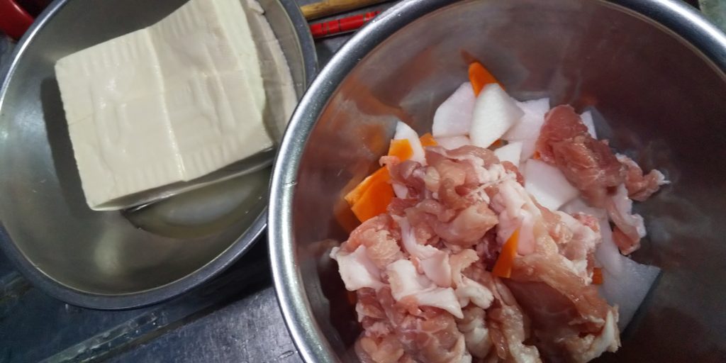 2.豚肉、大根、人参を油が残ったフライパンで炒める。確かそのあと豆腐も入れていた。